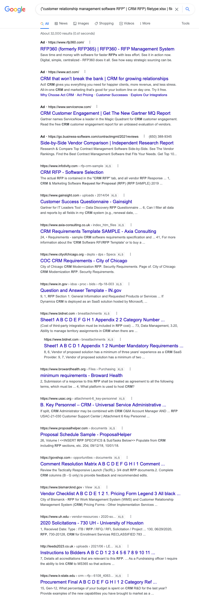Using the google technique developed in the LMGTFY: CRM RFP Software post – we found the following RFPs with this query: